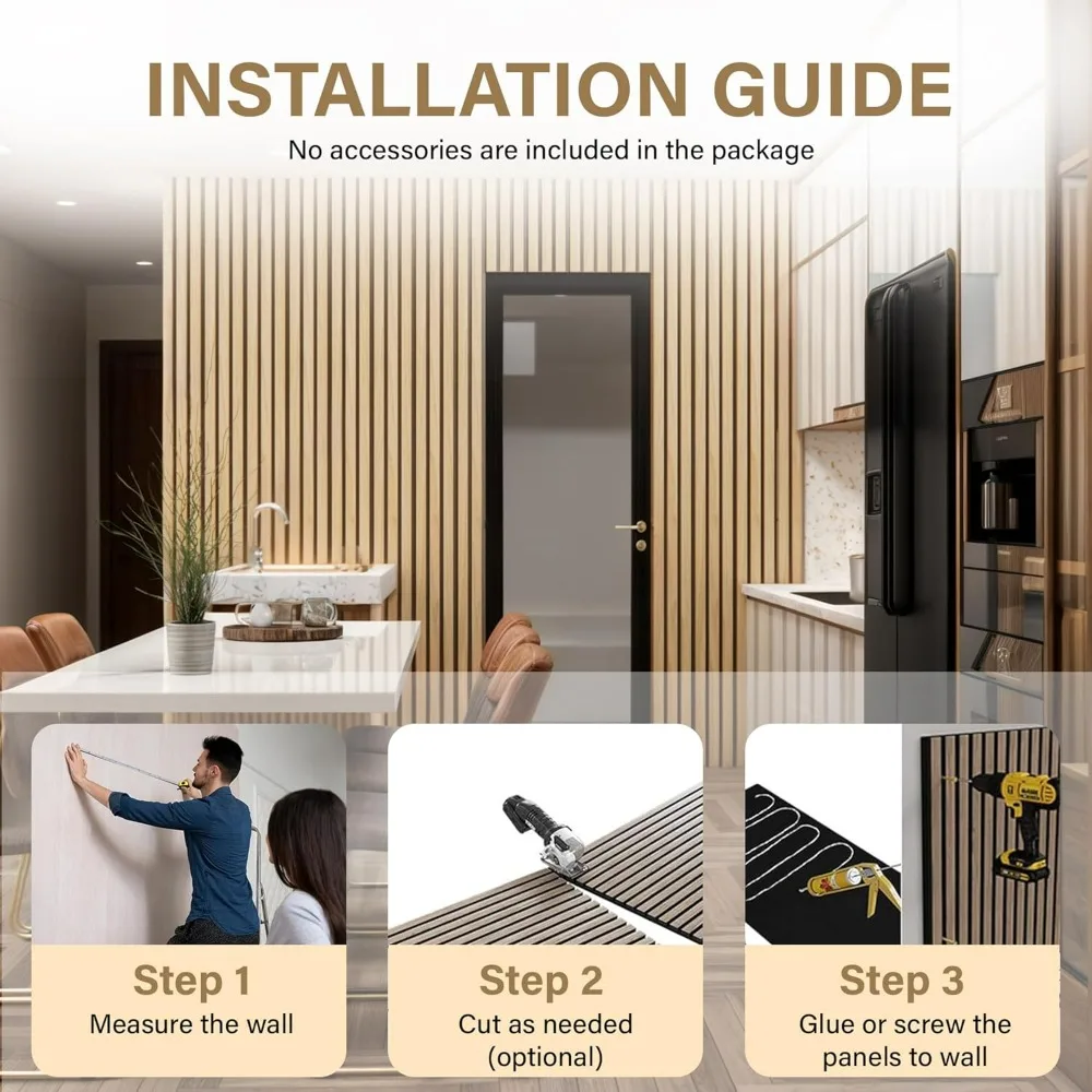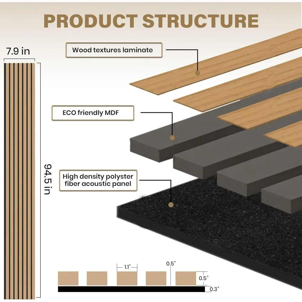 Our acoustic panels are designed for simplicity and functionality. They can be easily installed on walls or ceilings with basic tools, eliminating the need for complex procedures. These panels excel in soundproofing, making them an ideal choice for areas where sound quality is crucial, such as homes, offices, or studios. Constructed from high-quality MDF and dense polyester fiber, they are safe, emit low levels of harmful substances, and are environmentally friendly. The panels feature a beautiful wooden slat design that adds a touch of style and sophistication to any space. Each pack contains four panels, each measuring 94.5 inches by 7.9 inches, providing coverage for approximately 21 square feet.